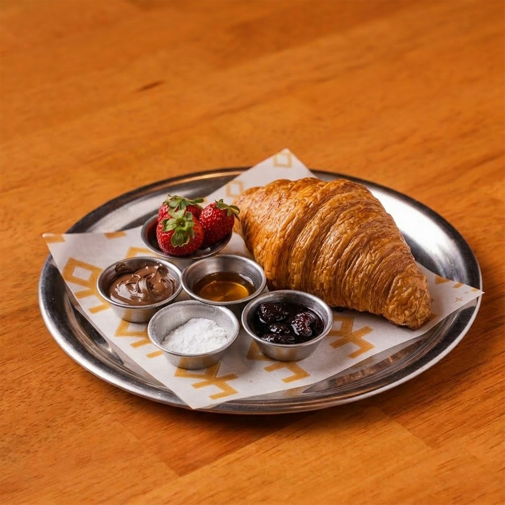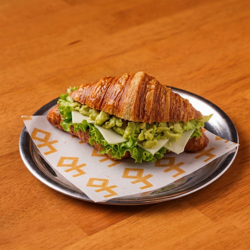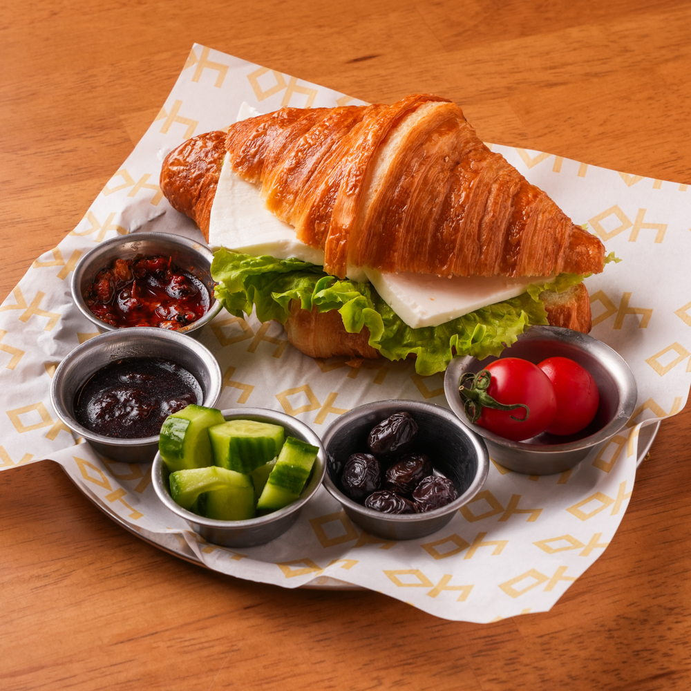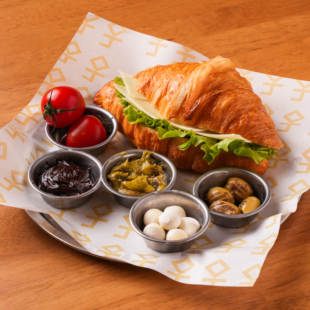 Kruvasan, labne, pesto sos, kıvırcık marul, kaşar peyniri, ızgara zeytin, smash avokado, fındık kreması, mini mozerella, çeri domates.